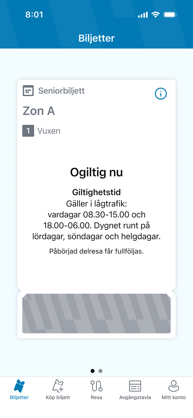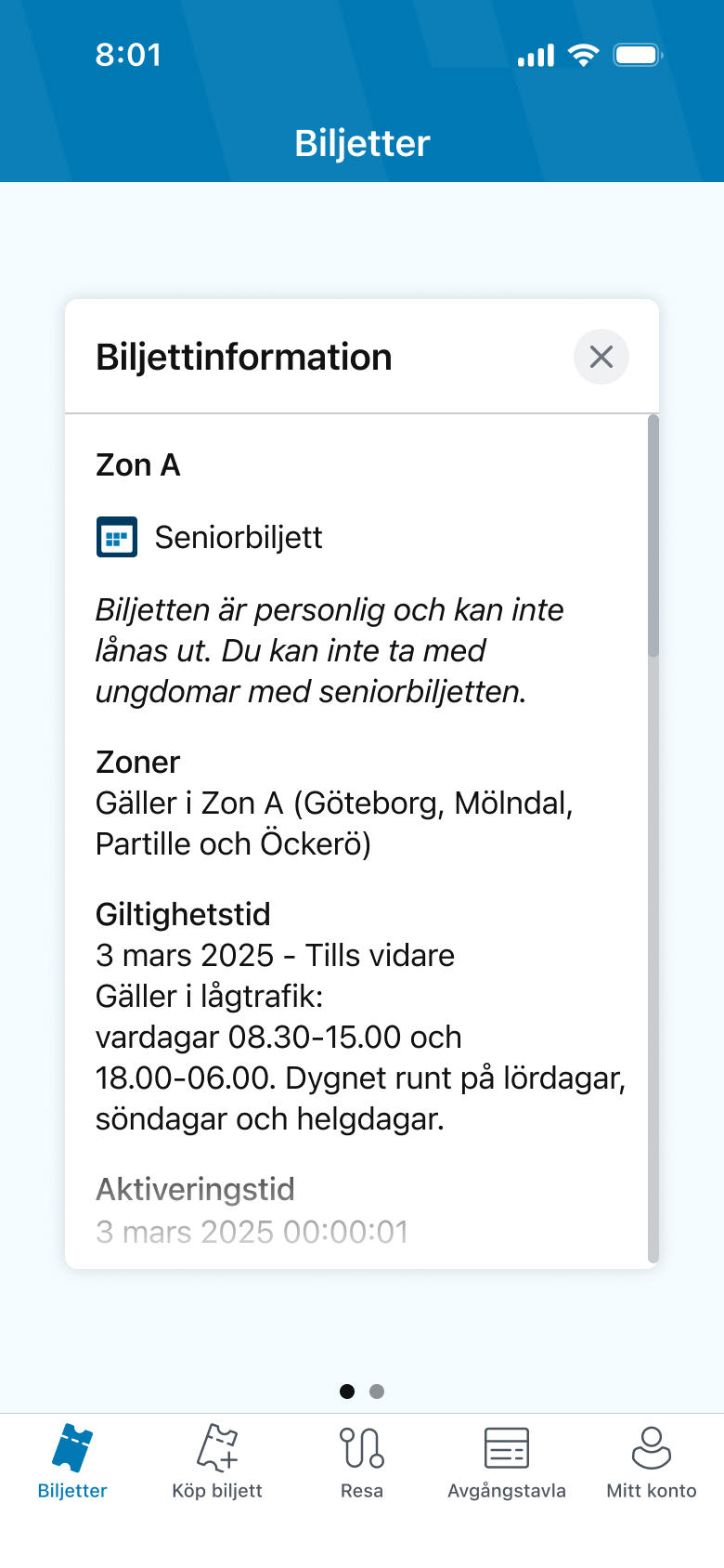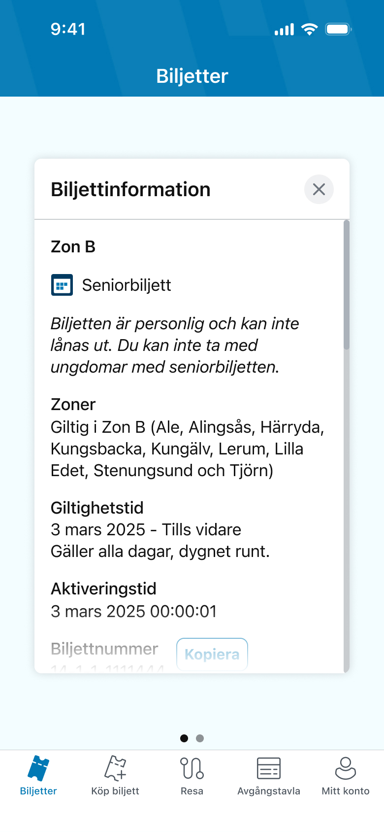 Seniorbiljetten är personlig och vid en biljettkontroll ska resenären kunna legitimera sig. Biljettens giltighet skiljer sig åt mellan kommunerna, till exempel så gäller några kommuners seniorbiljett endast under lågtrafik. Du kan läsa mer om seniorbiljetternas giltighet och villkor på vasttrafik.se/seniorbiljett.